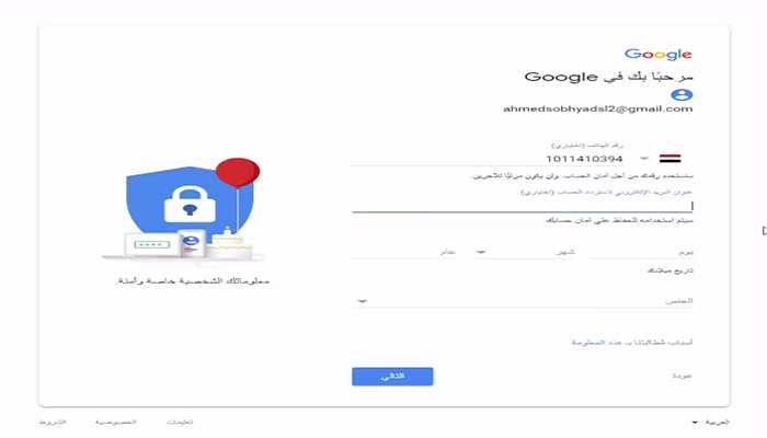 سينقلنا بعدها إلى وضع رقم الهاتف الذكى الخاص بنا وتلك هى اولى مراحل التامين والامان على الحساب وهو ربطة بهاتفك الخاص للحفاظ على معلوماتك الشخصية فى شركة جوجل