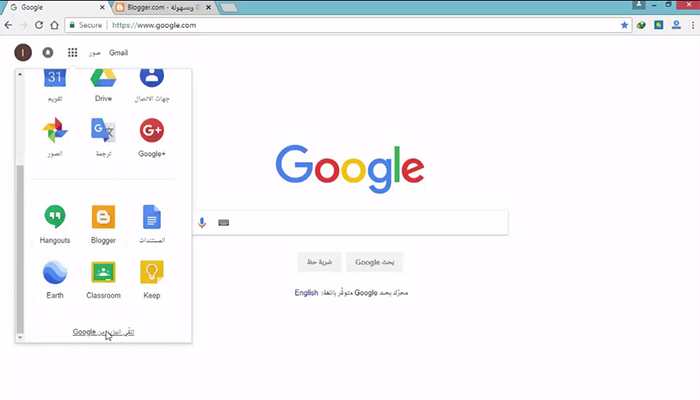 ولإنشاء مدونة جديدة قم بالدخول إلى Blogger.com او بالتوجة إلى حسابك في جوجل كما سنرى بالصورة القادمة والضغط على التطبيقات الخاصة بحسابك على جوجل والنزول للاسفل قليلا الى المزيد واختيار ايقونة Blogger
