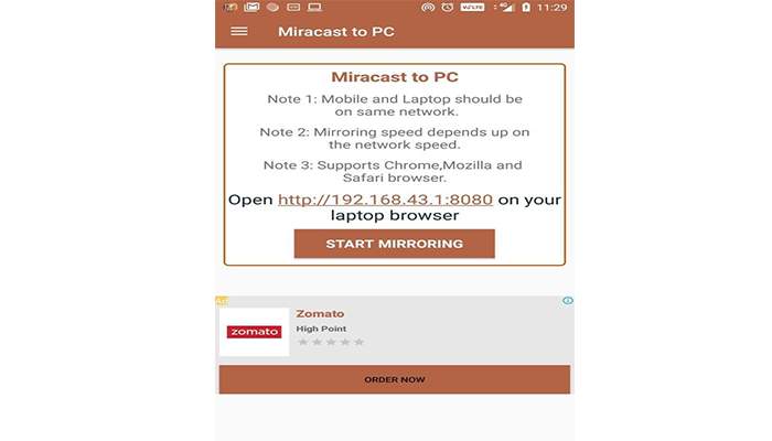 بعد الضغط على Mirroring To Pc ستنبثق امامنا نافذة يوجد بها المعلومات التى ستساعدنا فى ظهور شاشة الهاتف على شاشة الكمبيوتر وهى عبارة عن الايبى الذى سيتم كتابتة بالمتصفح الذى تستخدمة لتستطيع من خلالة ربط الجوال بالحاسوب كما سنرى بالصورة التالية ومن ثم التاكد من الايبى المتاح والمسموح بة من الهاتف يتم الضغط على زر Start Mirroring