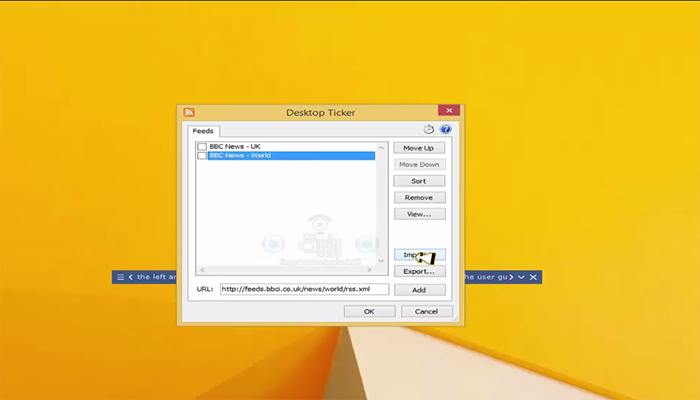 كما ذكرنا يمكننا عمل ذلك عن طريق برنامج صغير الحجم يسمى DesktopTickerSetup فكل ما عليك فعلة بالبرنامج هو اضافة كل المواقع التي تريد أن تتابعها سواء مواقع اخبارية او مدونات لمتابعة احدث الموضوعات والاخبار بها ولكنى اعتقد بان البرنامج يصلح بشكل كبير للاخبار